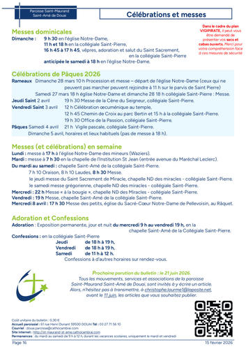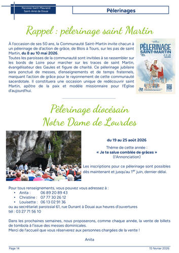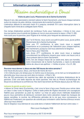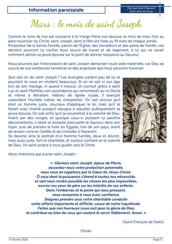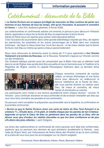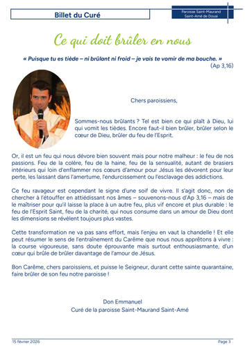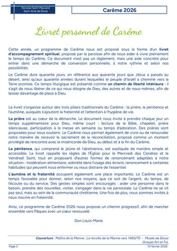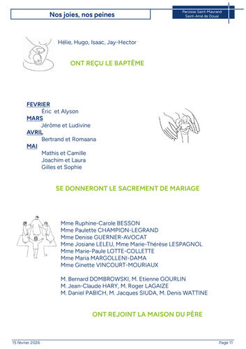 Vous trouverez en pièce jointe le bulletin paroissial publiéle 15 février 202630 novembre, 5 octobre, 15 juin, 2 mars 2025,24 novembre, 15 septembre, 5 mai, 11 février 2024,26 novembre, 15 octobre, 21 mai, 19 février 2023,27 novembre, 18 septembre, 21 mai, 27 février 2022,5 décembre et 17 octobre 2021. |